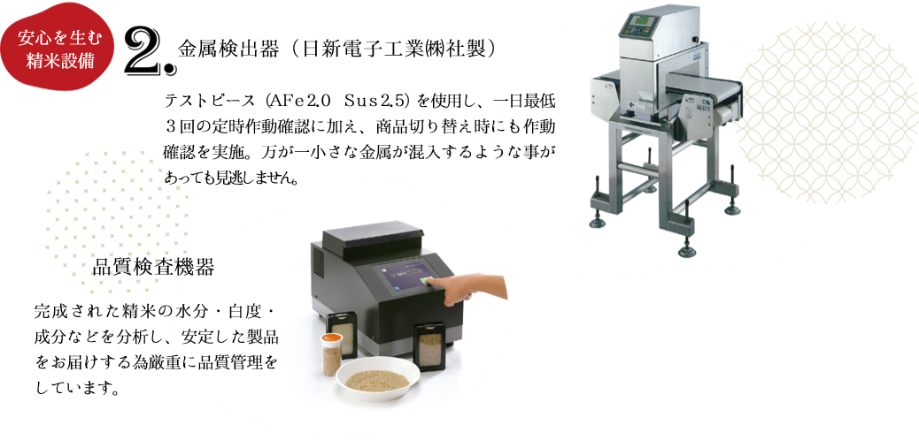 玄米から糠を取り除く「精米」のみならず、お米から異物を取り除く、「選別」と品質に問題ないかを確認する「検査」を実施しております。